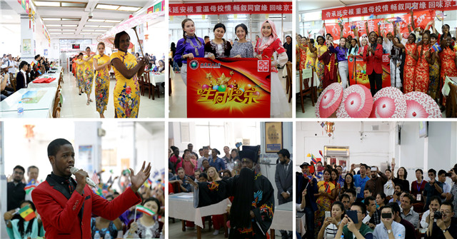中午12点,正是承担校友就餐任务的教工食堂用餐高峰期。在川流不息的人群里,突然出现一群身着旗袍、手持纸伞的外国面孔,伴随着动感十足的乐曲,她们成群结队、手舞足蹈,顿时点燃了食堂里所有就餐人员的热情,大家纷纷掏出手机,记录下这欢乐美好的一刻。这就是我校外国留学生们为校庆开放日精心准备并刻苦排练的快闪活动,通过舞蹈、京剧、武术、美声、合唱等表演形式,充分展示了他们的艺术才华和对中国风俗文化的深刻理解,也为广大校友们献上了一场“洋”味十足的中国文化大餐。