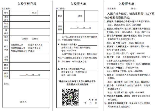 编辑:马瑶 审核:阎艳 王征 阅读次数:到人事处开具“入校服务单”,领取入职资料包,然后再到财务处登记工资账号,办理校园一卡通,仅仅需要简单的两个步骤,新入职的A系列教职工就可以轻松成为北京理工大学的一员了。