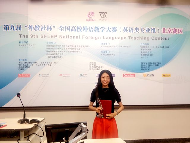 6月9日至10日,第九届“外教社杯”全国高校外语教学大赛北京赛区的复赛及决赛在对外经贸大学举行。本次比赛分为英语专业组和商务英语组,来自北京市40余所高校的50余名优秀教师参加角逐。北京理工大学外国语学院选派了曾在今年4月学院青年教师教学基本功比赛中教学演示环节荣获一等奖的青年教师刘露,代表北京理工大学参加英语专业组的比赛。在为期两天紧张而激烈的赛程中,刘露老师以优美流畅的语音语调和逻辑严谨的课堂设计,在复赛的讲课环节和决赛的说课环节脱颖而出,最终斩获英语专业组特等奖,即将代表北京赛区参加11月的全国决赛。