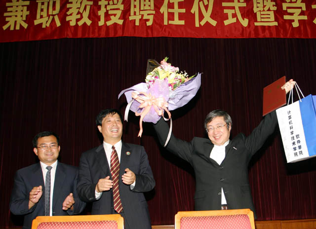 兼职教授仪式由人事处处长于倩教授主持,计算机学院副院长贾云得教授介绍了许博士的科学成就。