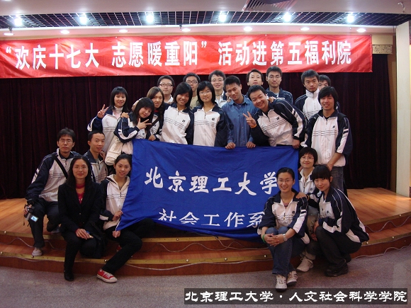 10月18日上午,北京理工大学人文社会科学学院2005级社会工作专业2班19名学生在刘颖老师和于建敏老师的带领下来到了北京市第五福利院,与北京市团市委一起组织了“欢庆十七大,志愿促和谐”大型志愿活动服务,为第五福利院的老人们送去节日的慰问与祝福。