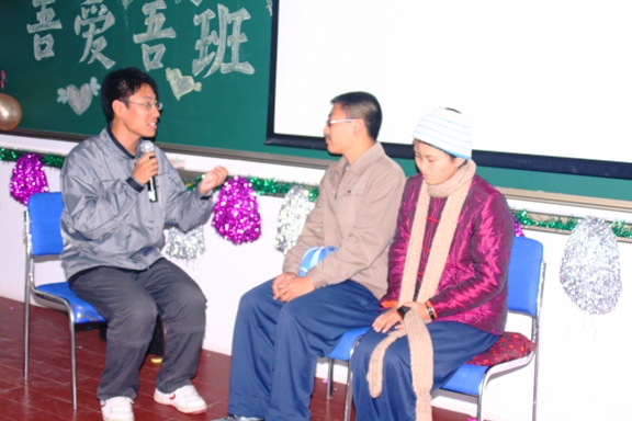 比赛分班级风采展示,班级合唱与自选节目表演三个部分。在班级风采展示环节,各个班都精心制作了班级ppt和DV视频,给在场同学做了汇报和展示。一班的合唱,二班的相声,三班的DV展示与行为艺术表演,四班的情景剧,这些精彩的节目都给评委与观众留下了深刻的印象。在中场休息环节,“痛并快乐着”这个游戏也让观众们好好的轻松了一把。