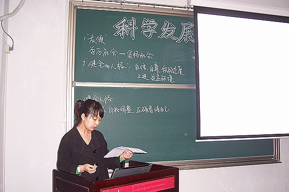 首先,由党支部入党积极分子代表郝凤霞讲述了她眼中的科学发展观。报告题为《大学生如何实践科学发展观》,她清晰而又简明扼要地阐述了大学生对于社会的重要意义,大学生成长过程中存在的普遍问题,如何应用科学发展观解决大学生中存在的问题等几方面问题,她认为,科学发展观中蕴含的世界观、方法论是指导我们学习成长的有力武器,可以使我们全面的审视自己,弥补缺陷,克服弱点,发扬优点,把自己塑造成为“具有高度的社会责任心、过硬的社会竞争力以及国际竞争力、个性与人格得到健全发展的高素质创新人才”。