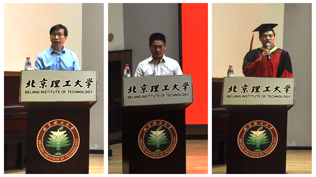 郭德洲同学代表2017年夏季毕业研究生发言,他通过回忆在菁菁校园中成长的点滴向母校、领导和老师们表示了深深的感谢和崇高的敬意,并祝愿北京理工大学和机电学院蒸蒸日上,续铸辉煌,祝福老师身体健康、万事如意,祝愿2017届全体毕业生扬帆远航、鹏程万里。王海福教授是机电学院兵器科学与技术学科特聘教授、博士生导师,2017年首届全国创新争先奖获得者,2016年国家技术发明奖二等奖获得者,毁伤与弹药工程系主任,本次典礼中作为教师代表发言。他引用《周易》中的“天行健,君子以自强不息。地势坤,君子以厚德载物。”表达自己对毕业生们的殷切期许,希望同学们都能成为自强自立、具有深厚品德的祖国栋梁。王老师还教导毕业生们要懂得感恩,要对国家和学校的培育常怀感恩之心,要用自身行动来践行这一份感恩之情。随后,机电学院院长陈鹏万致辞,他对毕业生们提出三点希望,即“希望同学们树立崇高的理想;希望同学们勿忘科研精神;希望同学们任何时候都要勇于担当”,并祝愿同学们身体健康、生活愉快,在未来的旅程中努力拼搏,用自己的力量回馈社会,成为一个对社会有贡献的人。