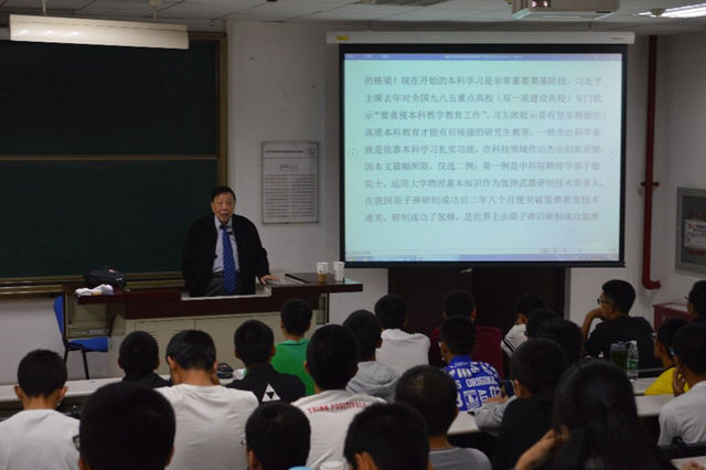 王越先生首先祝贺书院学子们以优等高考成绩进入北京理工大学重点学科群学习,并希冀书院学子努力以优异成绩完成本科学习,成为伟大中华复兴、维护世界和平发展的栋梁之才!之后,王越先生要求全体学子从“本科”起步打好基础,并用于敏院士、包为民院士的生动事例说明本科教育的重要性。最后,王越先生以信息、信息科技及信息系统现时发展认识简要讨论和“互联网+”主发展模式(国际对于IOT)主导下多信息科技嵌入系统构建信息社会高性能基础设施体系简要讨论作为讲座的主体内容进行了论述。